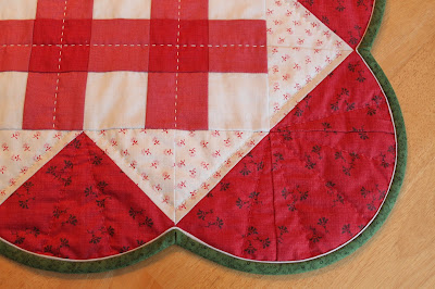 I used patchwork in cream and two shades of red to create the gingham picnic cloth center of my quilt. The watermelon border is comprised of a cream print and a red print with little black flowers that mimic watermelon seeds. To achieve the watermelon slice effect, I first sewed a narrow cream piping to the scalloped edge and then used a green print for the binding and voilà… a watermelon rind. Here’s a close-up of the edge: