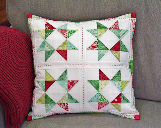Here’s Candy Stars finished as a Christmas pillow and made with Kate Spain’s beautiful “North Woods” fabric: