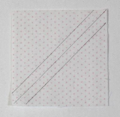 2. On the wrong side of each of the 14 background fabric 2½” x 2½” squares, lightly draw a diagonal line from corner to corner. Then draw a line a scant ¼” on either side of the center diagonal line.