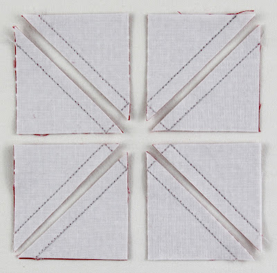 4. Use a rotary cutter to cut the unit in half vertically and horizontally and in between the seams to make 8 half-square-triangle units.
