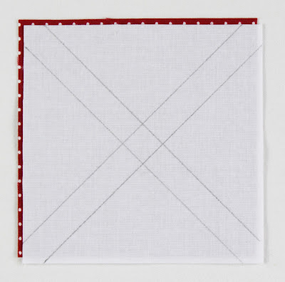 2. Layer a marked white 4″ square atop a red/green print 4″ square with right sides together.